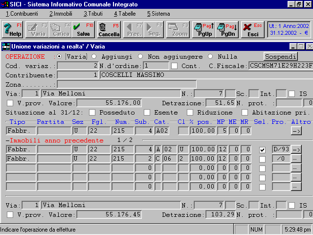 29.Tributi → ICI → Stampe → Incoerenze → Controllo contitolari I contitolari sia delle denunce 1993 che delle variazioni sono legati all'immobile tramite il numero d’ordine. Di conseguenza basta un minimo errore su tale campo per far “sparire” un contitolare.