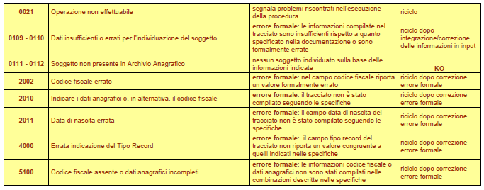 Chi sono i contribuenti che hanno un errore nel codice di ritorno (nell'esempio sopra riportato la riga evidenziata in giallo)? Per ogni contribuente, Siatel nel file di ritorno indica lo stato della ricerca che ha fatto nella propria banca dati. La procedura importa solo i contribuenti che hanno come codice di ritorno "0000","0001","0002","0003","0006","0007","0009","0111","0112". I codici di ritorno sono i seguenti: